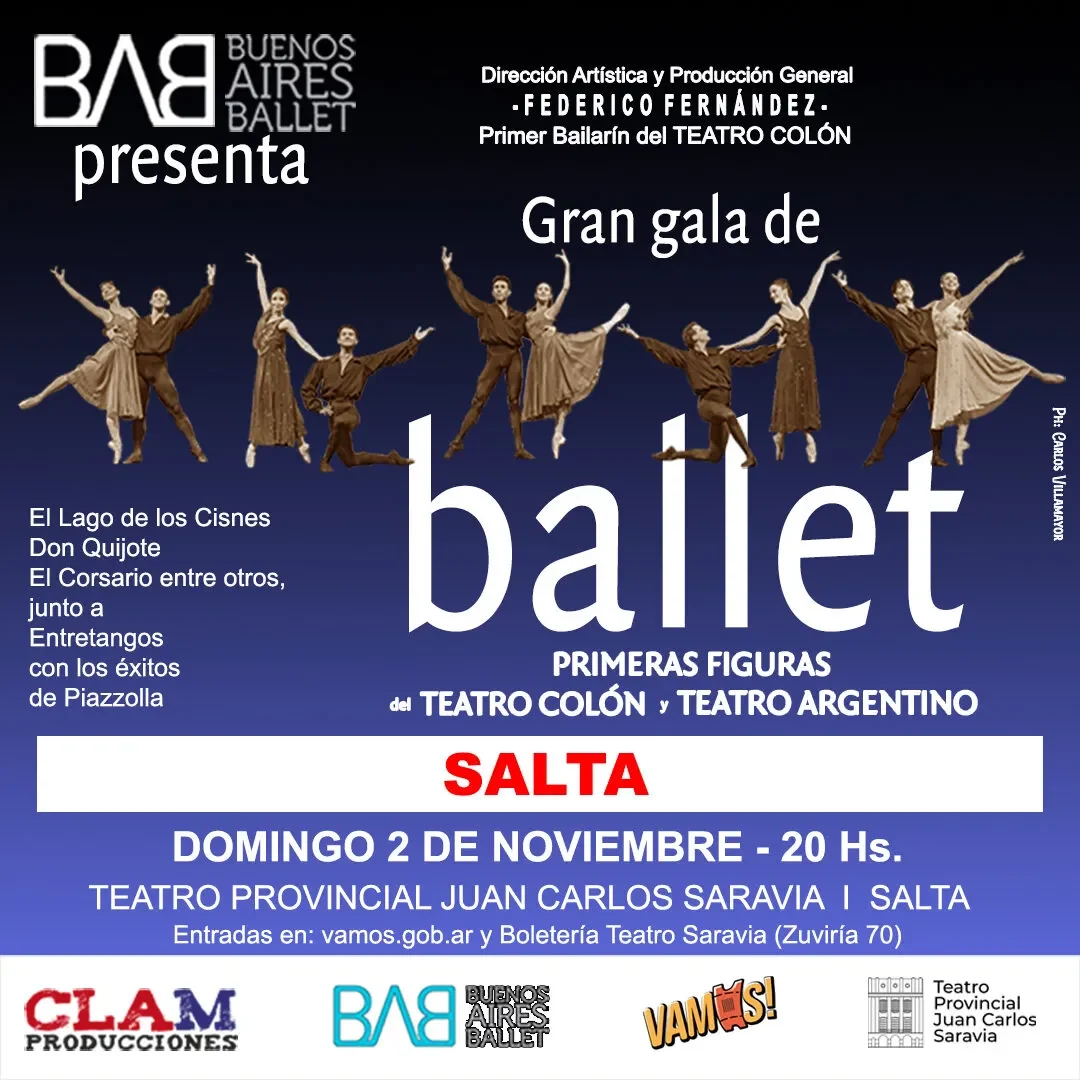 En el marco de su Gira Nacional 2025, el BUENOS AIRES BALLET vuelve a SALTA para presentar su nuevo espectáculo “GRAN GALA DE BALLET” que incluye los más memorables fragmentos del repertorio internacional: El Lago de Los Cisnes, Don Quijote, El Corsario, entre otros, y ENTRETANGOS con los grandes éxitos de Astor Piazzolla, todo en una sola noche.