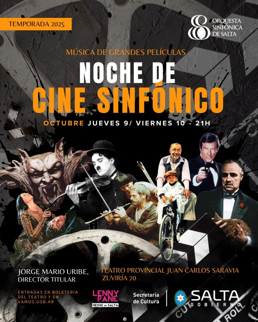 La Orquesta Sinfónica de Salta presentará el gran concierto "Noches de Cine Sinfónico" los próximos días jueves 9 y viernes 10 de octubre a las 21 horas en el Teatro Provincial Juan Carlos Saravia. El espectáculo estará dirigido por el maestro titular de la OSS, Jorge Mario Uribe.