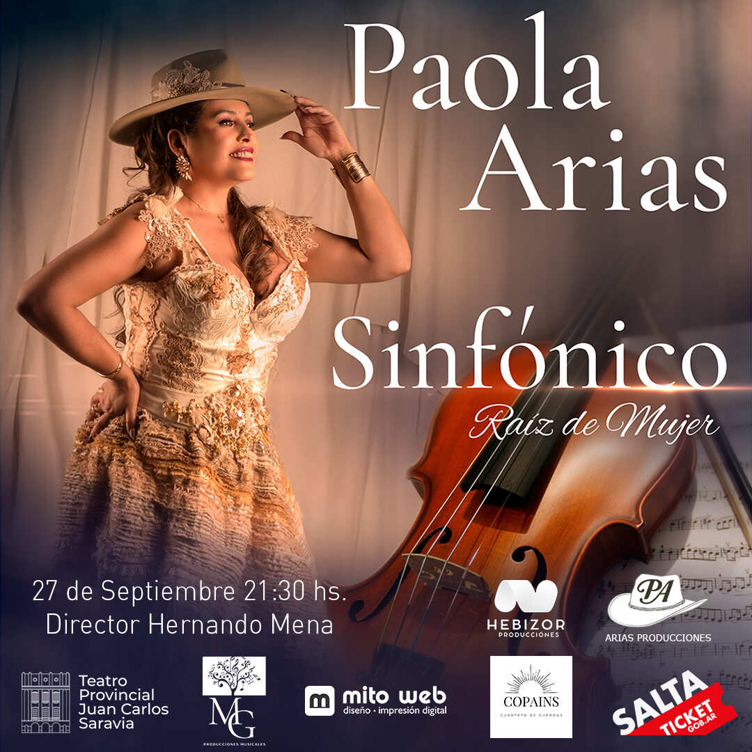 La destacada artista salteña Paola Arias presenta en un espectáculo de gran formato que une la fuerza del folclore con la potencia de una orquesta sinfónica, bajo la dirección del reconocido Hernando Mena y la producción de Hebizor.
